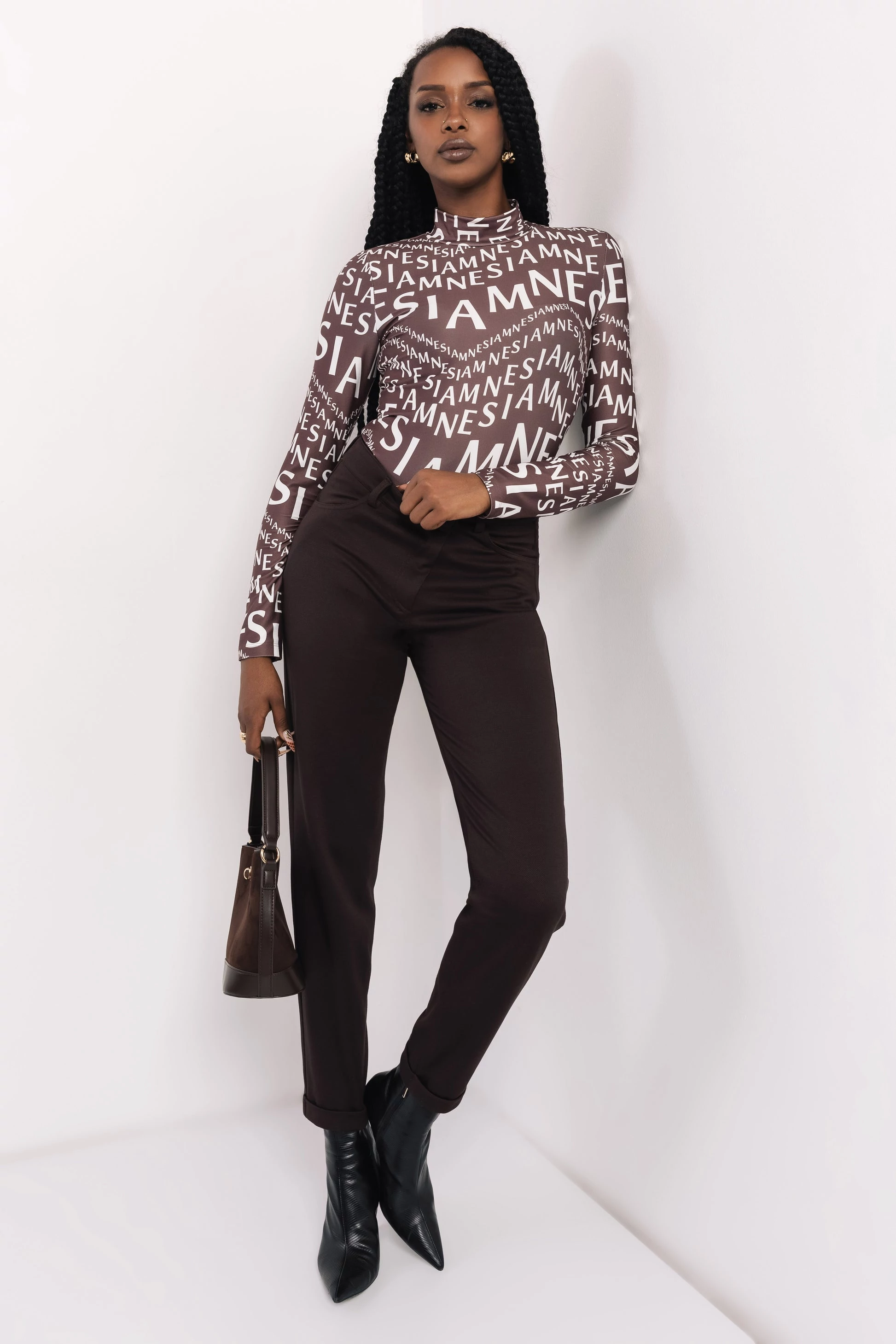 Termékleírás: Az AMNESIA Kabul nadrág a modern, letisztult elegancia megtestesítője. A twill anyagból készült, enyhén szűkülő szárú fazon kényelmes, mégis határozott vonalakat ad a sziluettnek. A magasított derékrész optikailag nyújtja az alakot, a szabás pedig minden mozdulatnál tökéletes tartást biztosít. A fekete és csokibarna árnyalat klasszikus alapdarabbá teszi, amely jól kombinálható a kollekció logómintás felsőivel – például az AMNESIA Dini garbóval vagy az AMNESIA hosszú ujjú pólóval. Viseld magassarkú bokacsizmával a nőies megjelenésért, vagy sportcipővel egy laza, hétköznapi stílushoz.