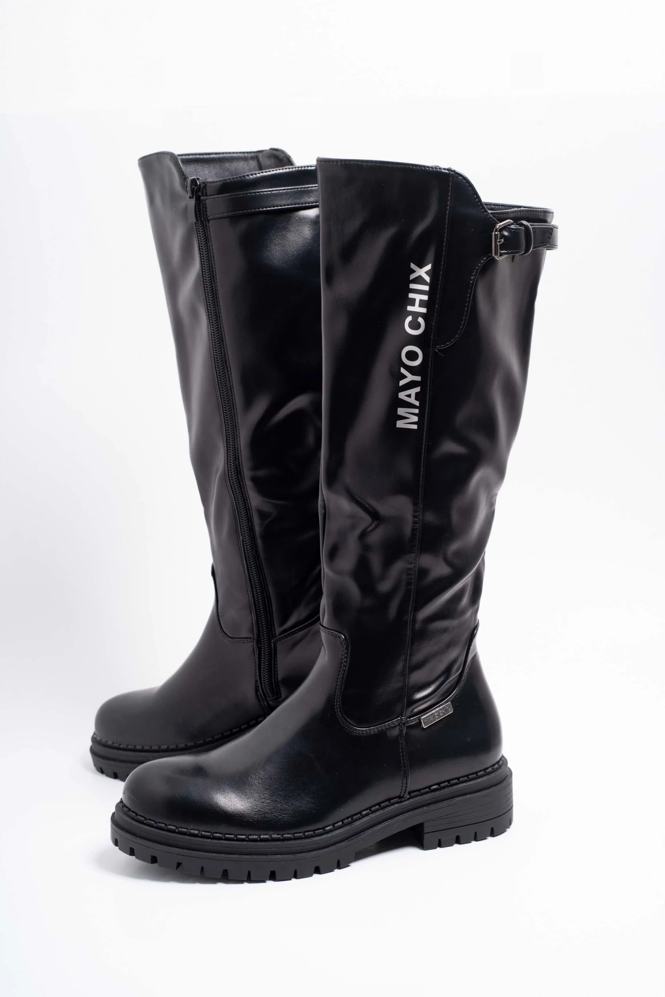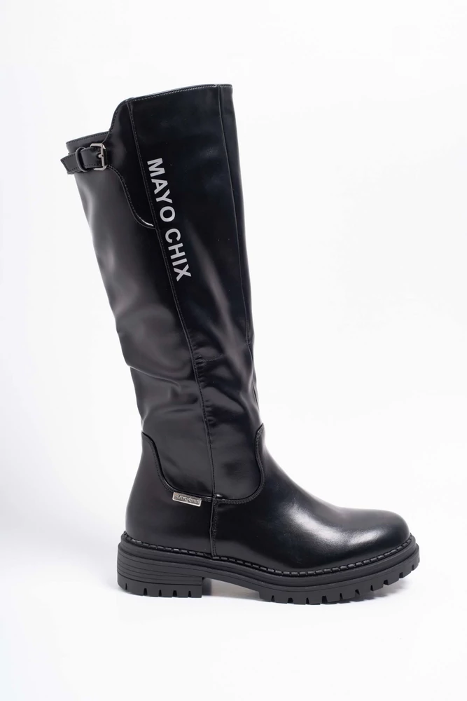 Termékleírás: Műbőrből készült csizma, cippzáras záródással, puha bélés anyaggal, filmnyomott márkajelzéssel.