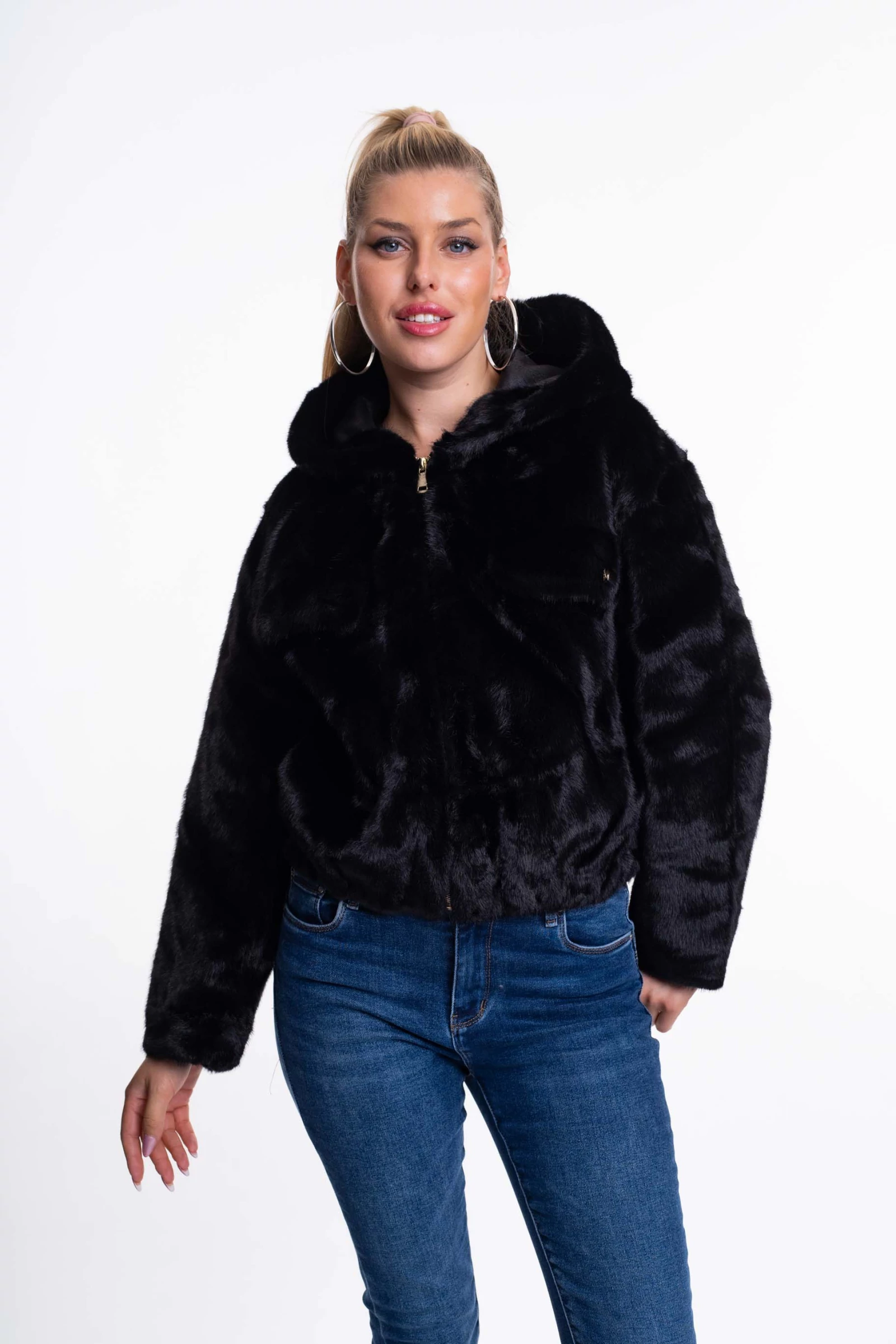 Termékleírás: Nagyon puha műszőrből készült, rövid fazonú, kapucnis kabát, cippzáras záródással, gumírozott aljarésszel, levehető fém bross márkajelzéssel.