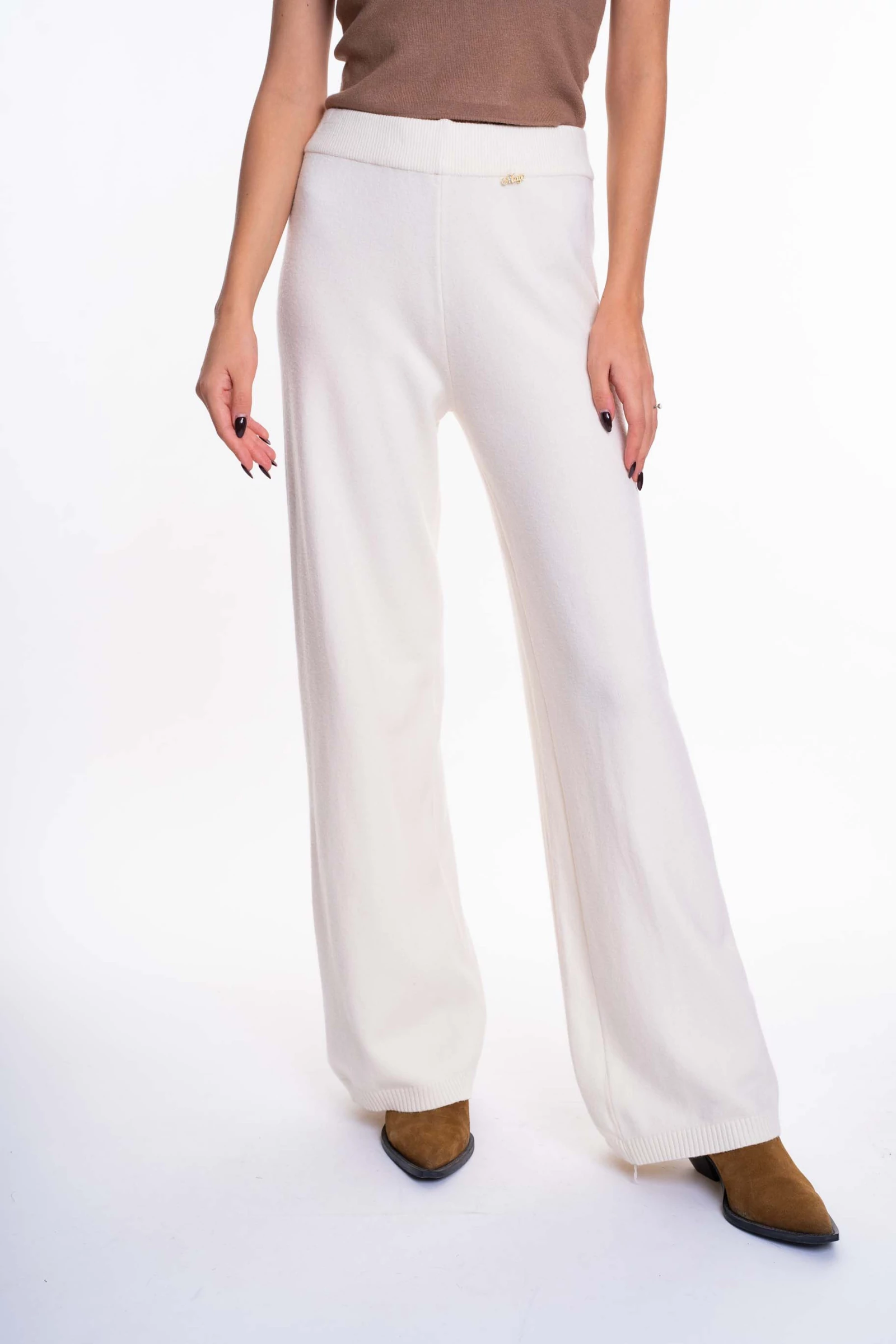 Termékleírás: Vékony, kötött anyagú, lezser szabásvonalú nadrág, gumis derékrésszel, mosáshoz levehető fém bross márkajelzéssel.