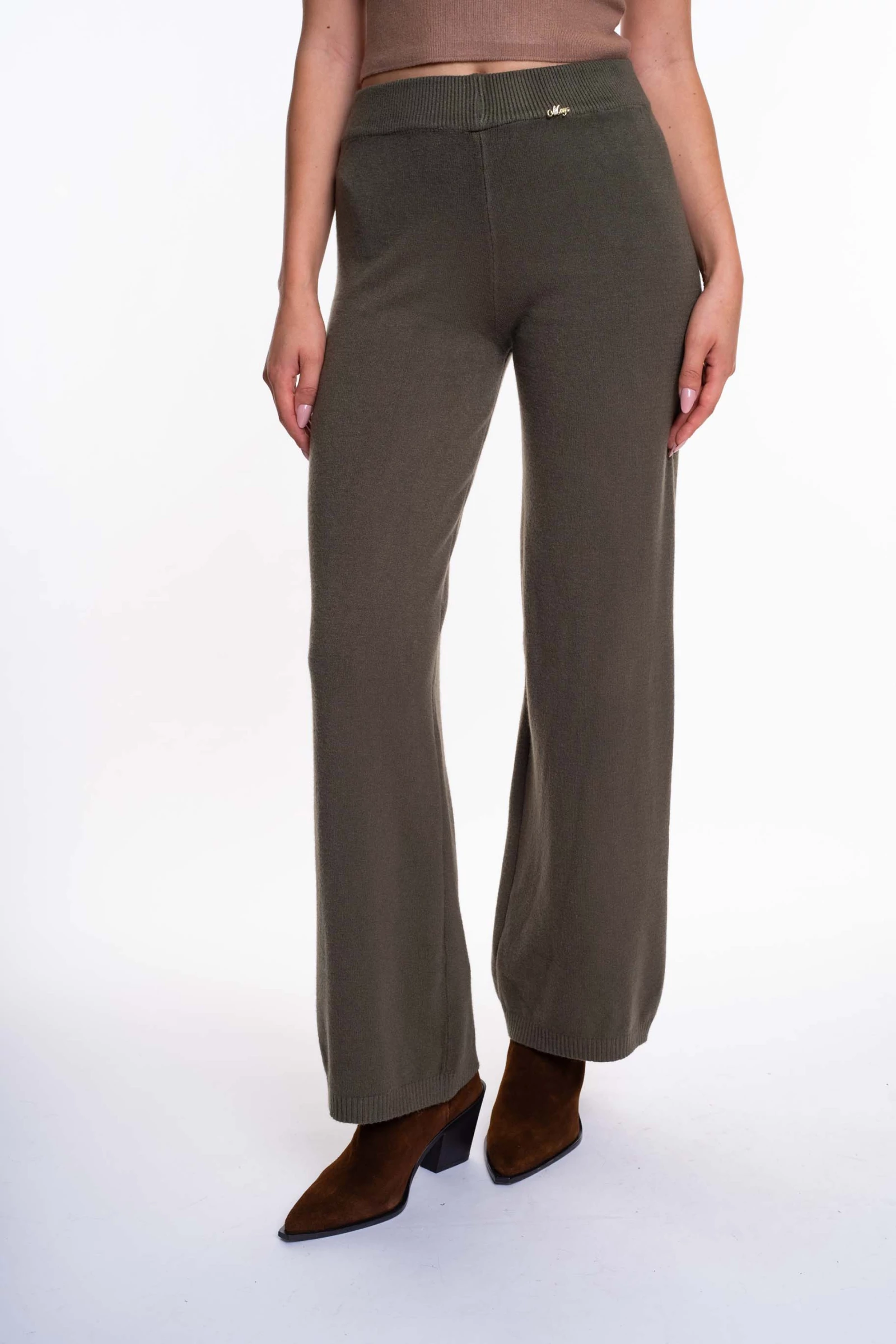 Termékleírás: Vékony, kötött anyagú, lezser szabásvonalú nadrág, gumis derékrésszel, mosáshoz levehető fém bross márkajelzéssel.
