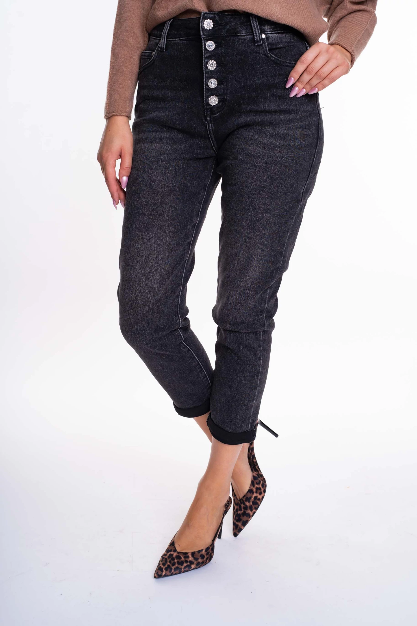 Termékleírás: Elasztikus anyagból készült, strasszköves gombos záródású farmernadrág, farzsebén strasszköves matricanyomott márkajelzéssel.