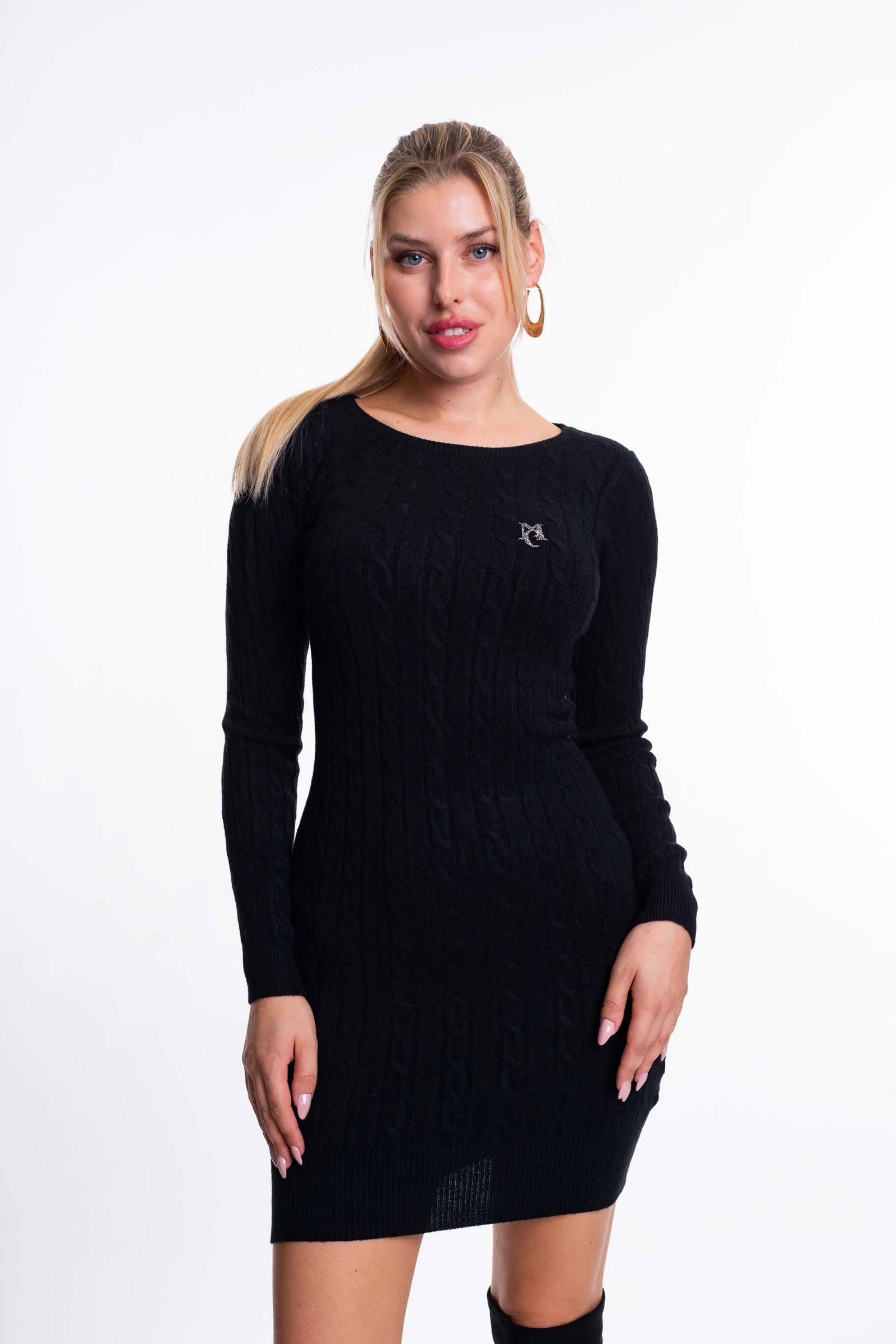 Termékleírás: Anyagában kötött mintás anyagú, karcsúsított fazonú ruha, strasszköves matricanyomott márkajelzéssel.
