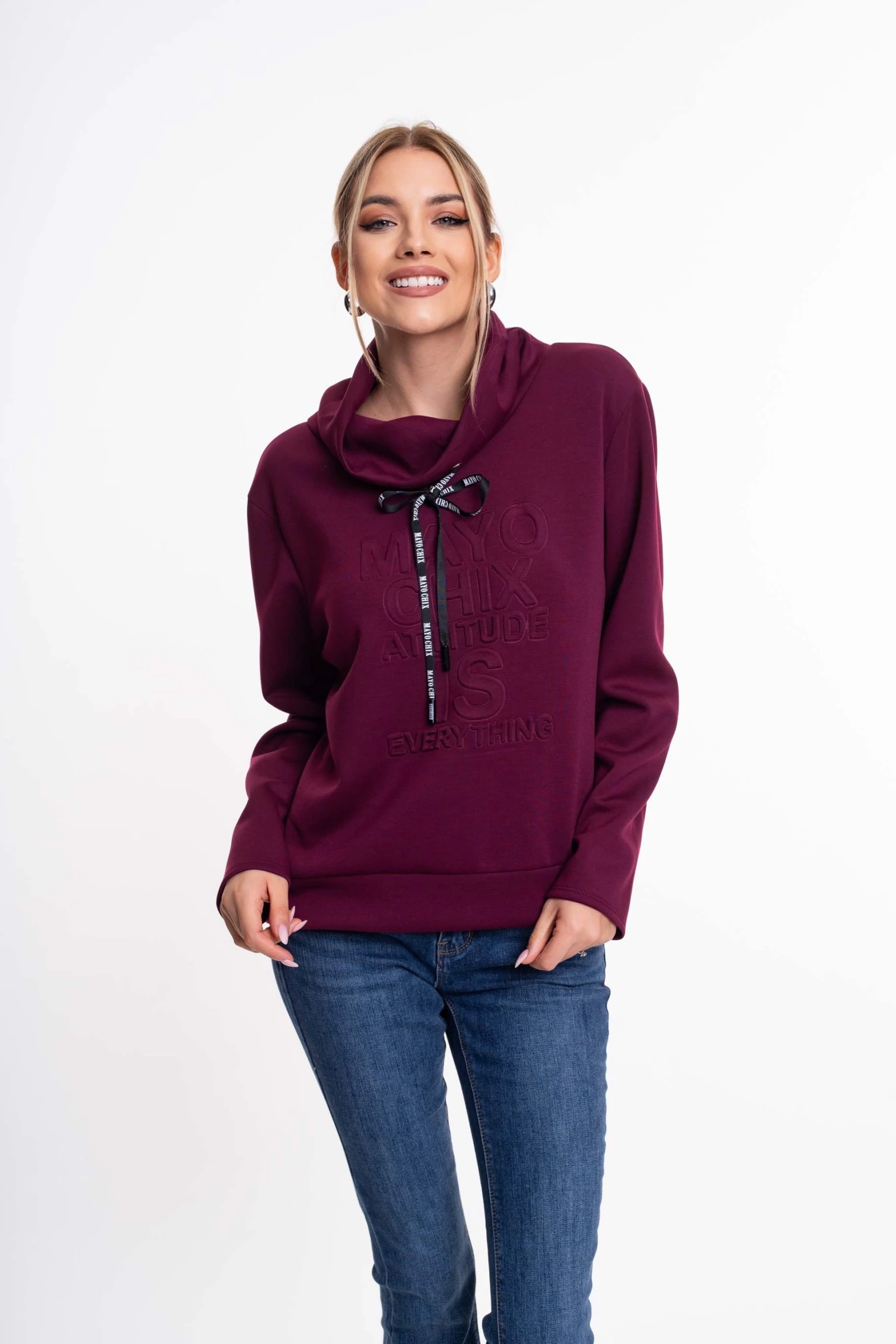 Termékleírás: Elasztikus anyagból készült, lezser szabásvonalú, kámzsás nyakú felső, dombornyomott mintával, márkajelzett behúzóval.