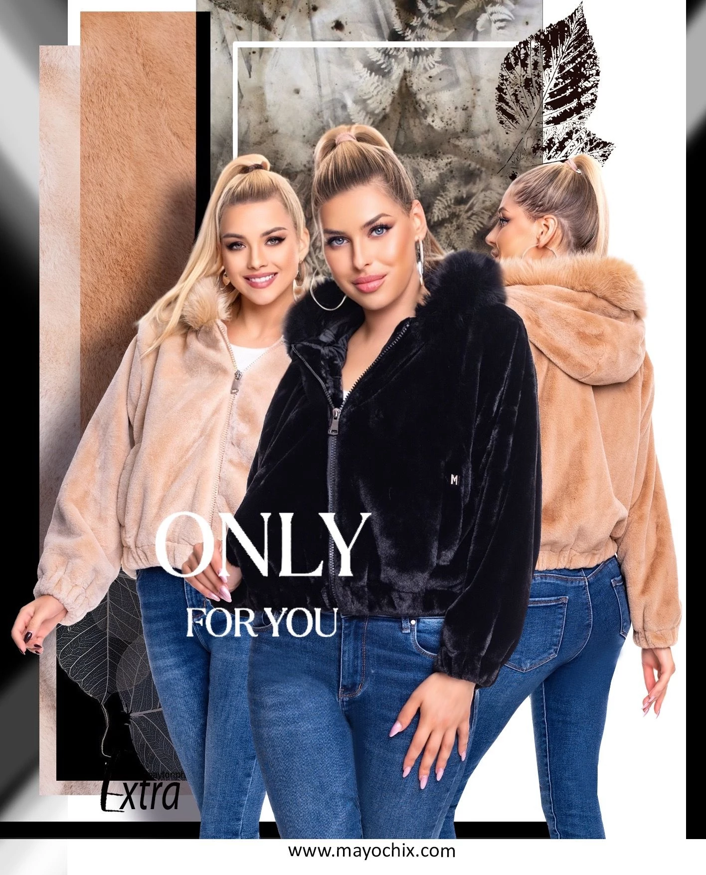 Termékleírás: Nagyon puha műszőrméből készült, rövid fazonú, kapucnis kabát, cippzáras záródással, gumírozott aljarésszel, levehető fém bross márkajelzéssel.