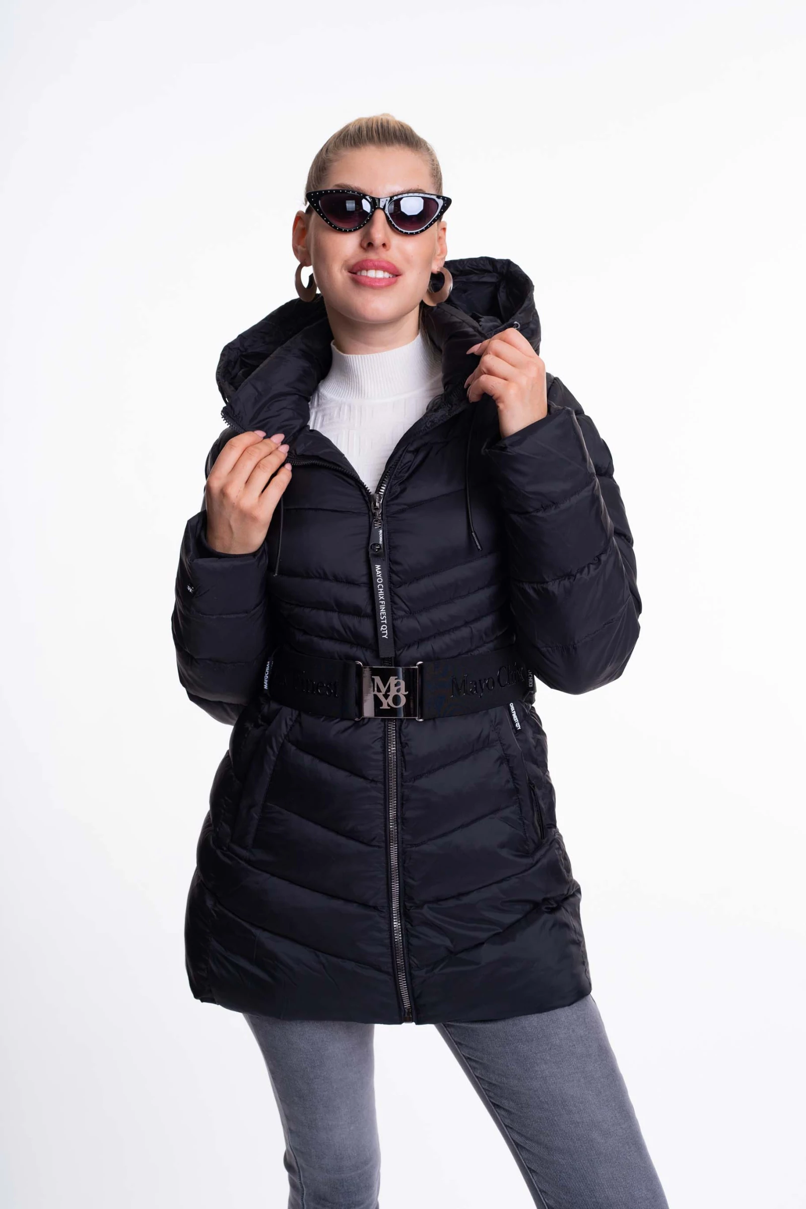 Termékleírás: Steppelt kabát, zsebekkel, kapucnival, saját övvel.