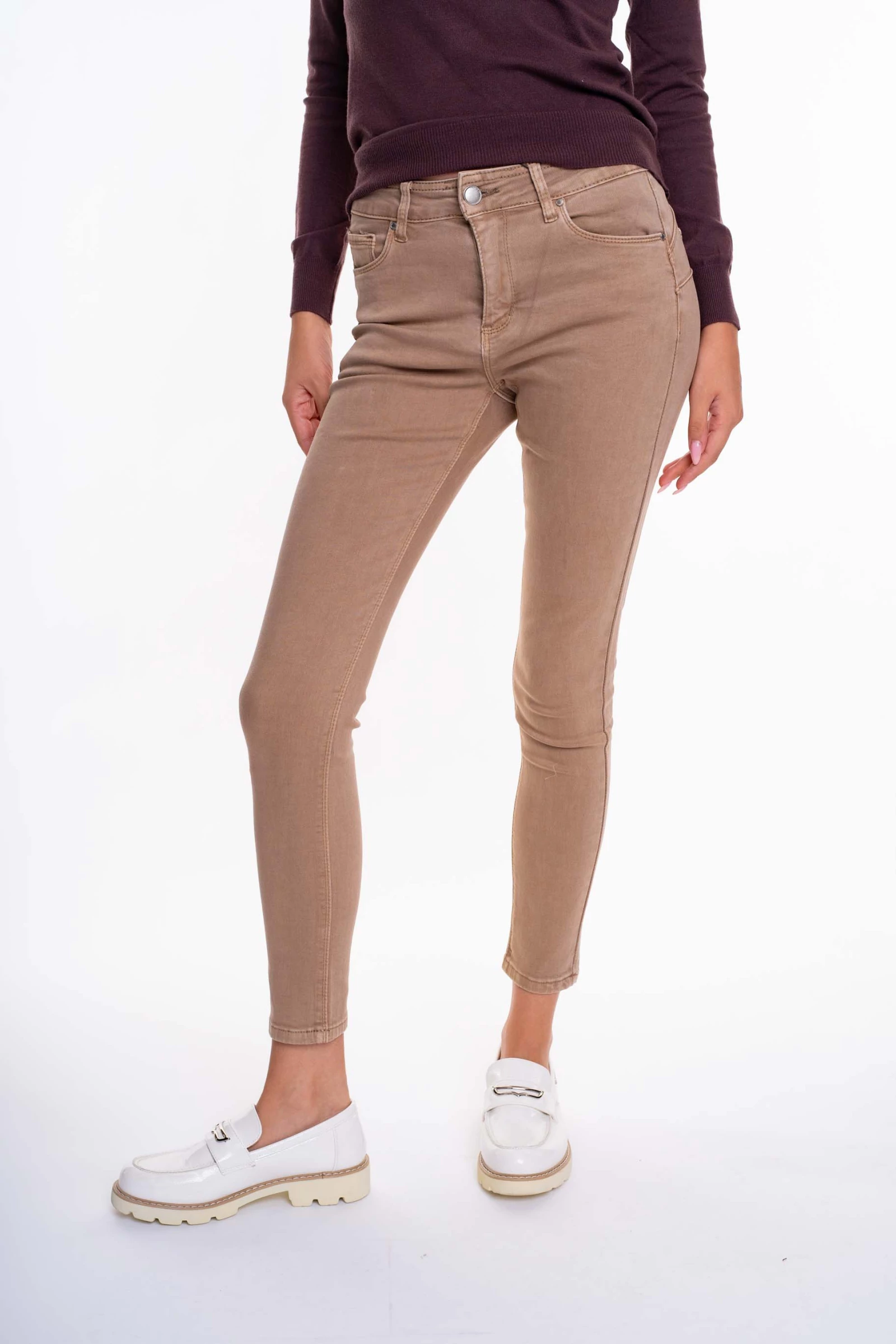 Termékleírás: Elasztikus anyagból készült, szűk szárú farmernadrág, dombor matricanyomott márkajelzéssel.