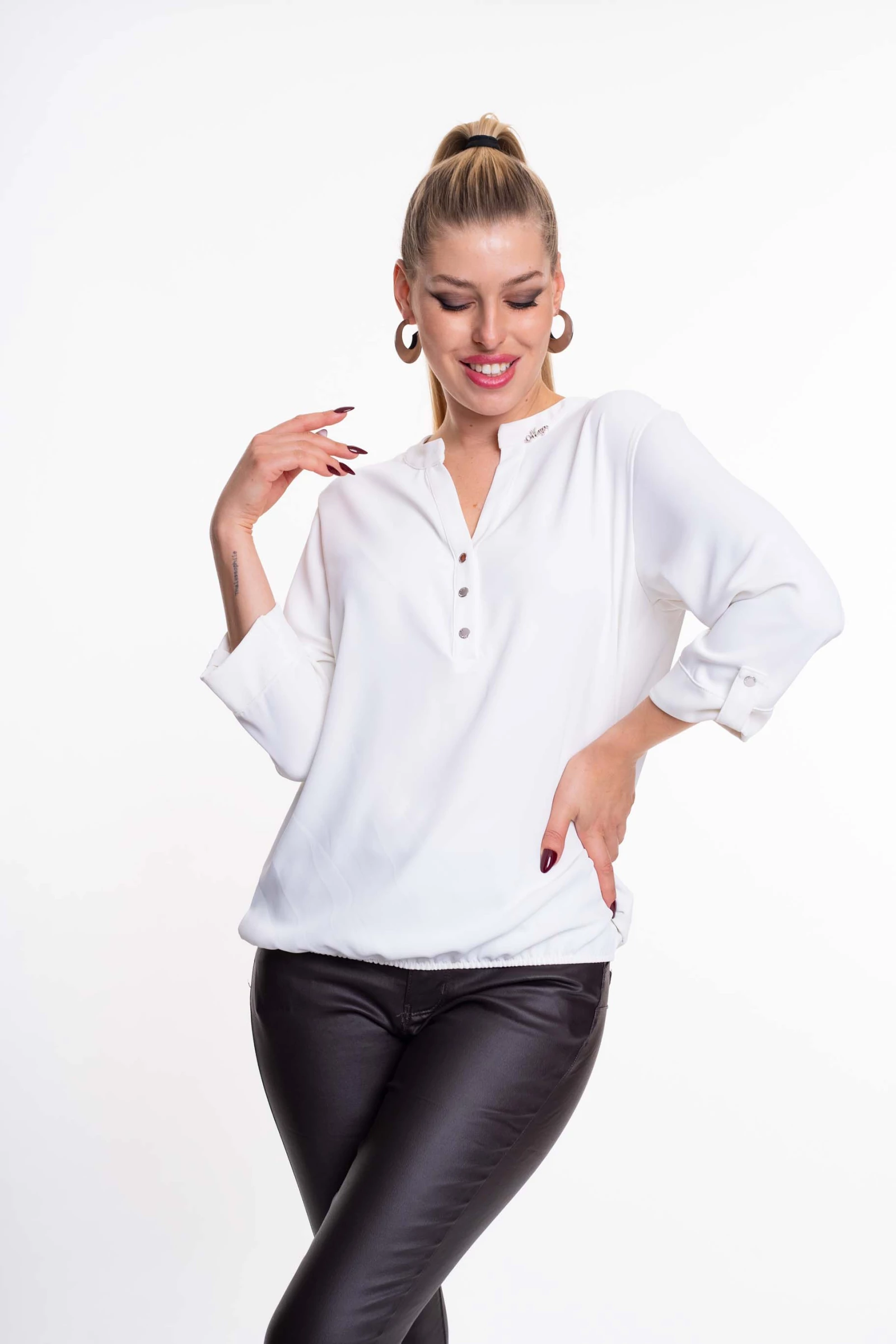 Termékleírás: Lezser szabásvonalú, elején gombos blúz, enyhén elasztikus anyagból, alján gumírozással, gallérján strasszos kis fém márkajelzéssel.