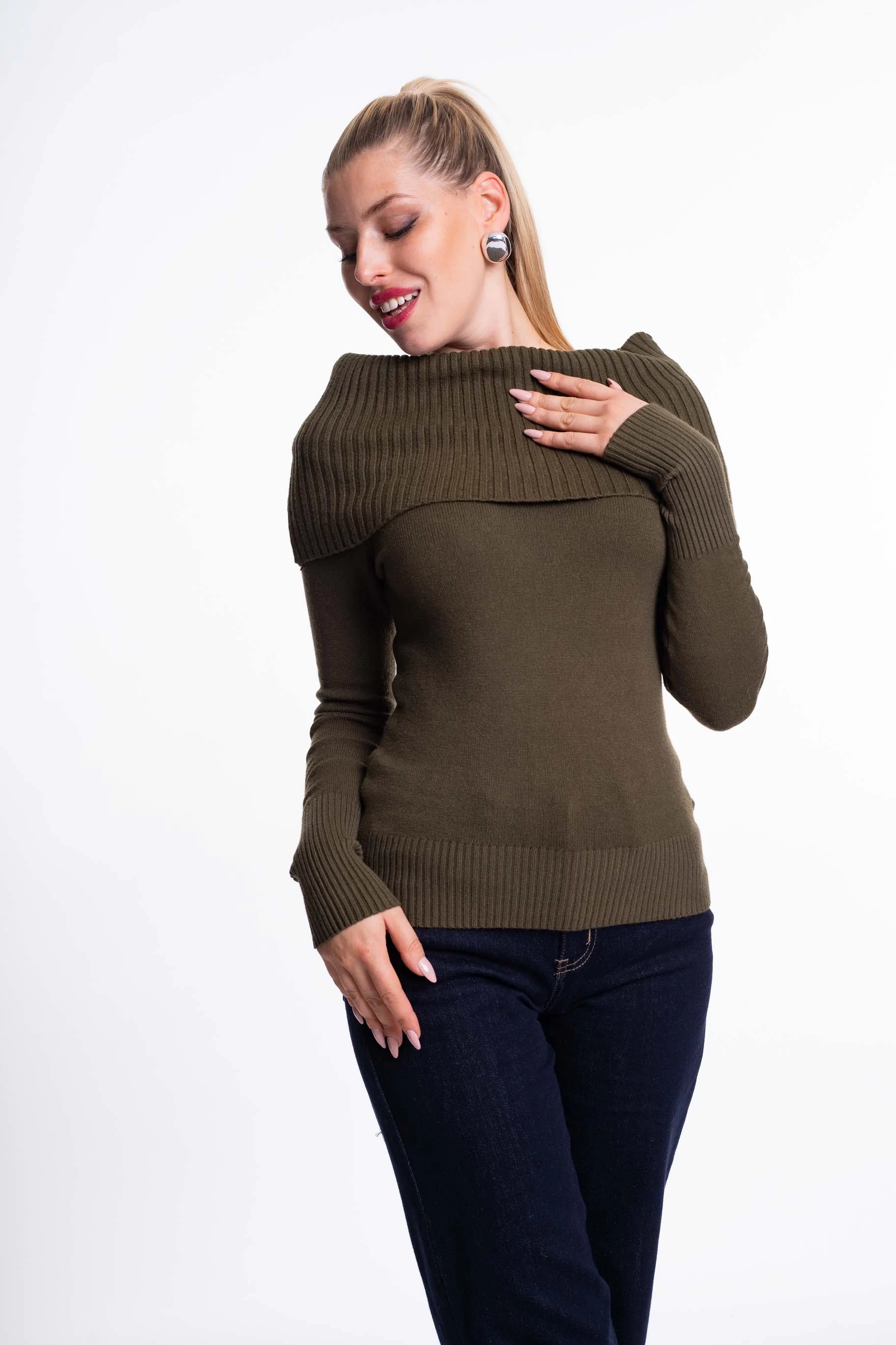 Termékleírás: Bordás, kötött anyagból készült csónak nyakú pulóver, strasszos matricanyomott márkajelzéssel.