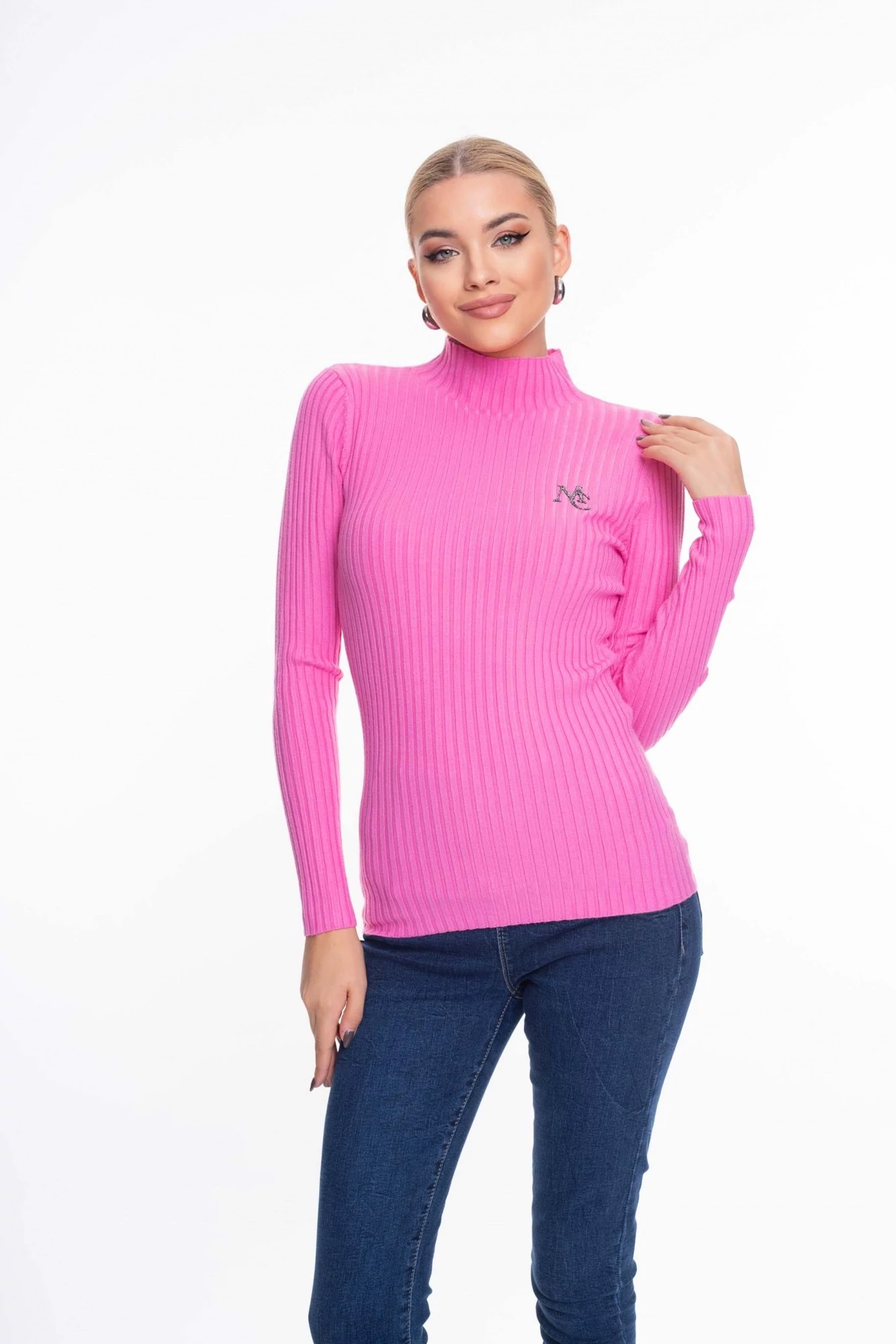 Termékleírás: Vékony kötött, karcsúsított fazonú pulóver emelt nyakrésszel, bordázott felülettel, strasszköves matrica díszítéssel.