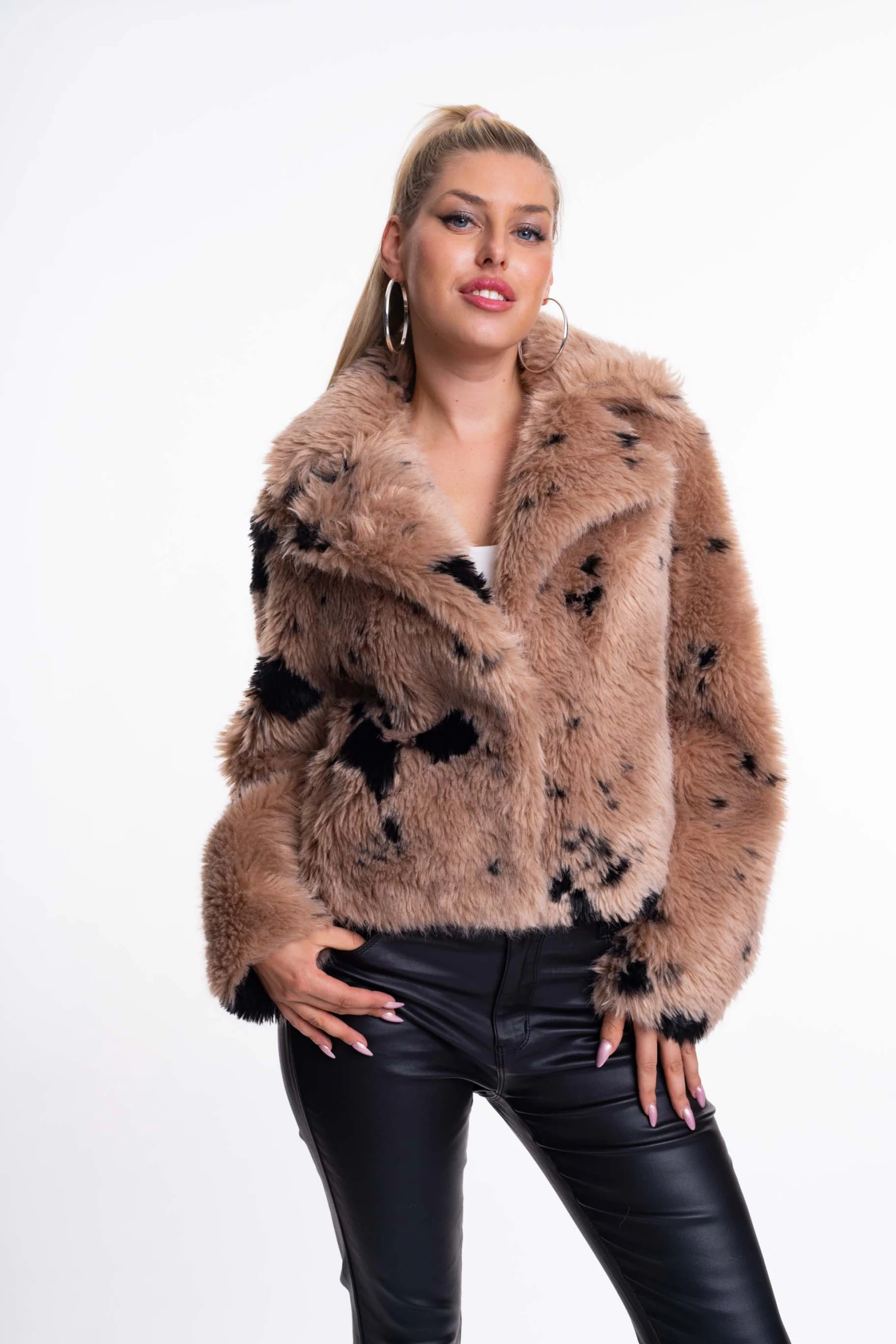 Termékleírás: Puha műszőrből készült, bő szabású, zsebes kabát, kapcsos záródással, levehető fém bross márkajelzéssel.